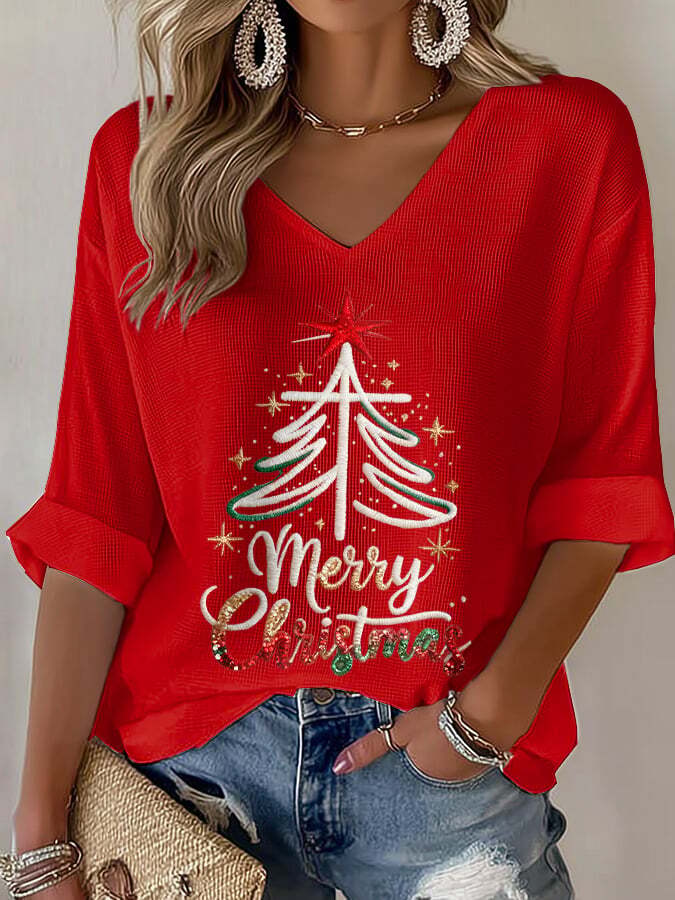Women's Christmas Print Waffle Long Sleeve T-Shirt